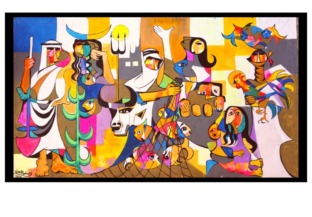 الفنان علاء في لوحته يحاكي بيكاسو قي هذا العمل بين رموز الفلاح و المراءة وتعابير اخرى عراقية